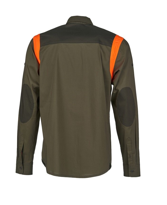 Camicia da caccia VALLEY in tessuto misto cotone elasticizzato con al petto doppia tasca con cerniera più doppia tasca con pattina. Inserti in tessuto arancione alta visibilità. Maniche avvolgibili. SPEDIZIONE GRATUITA