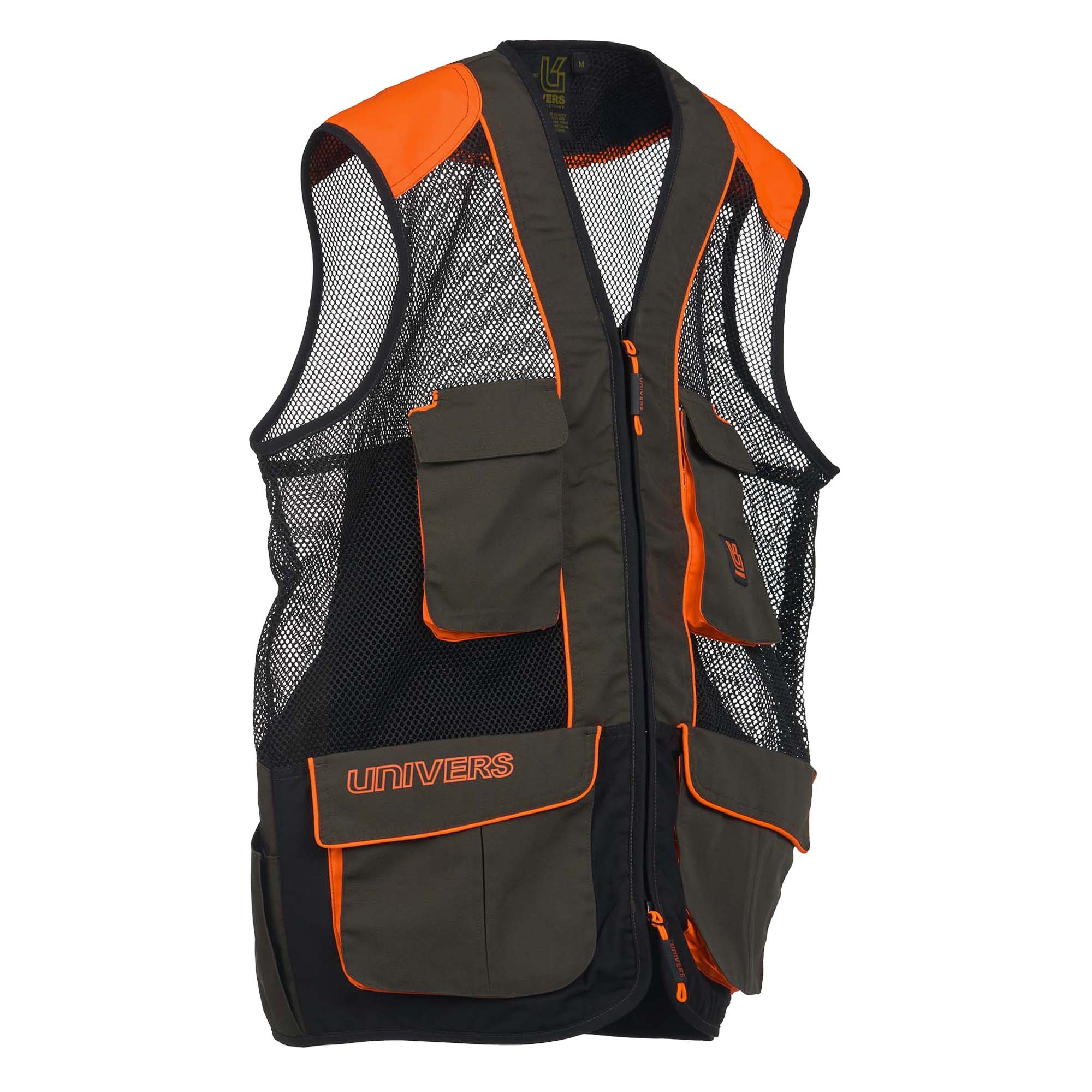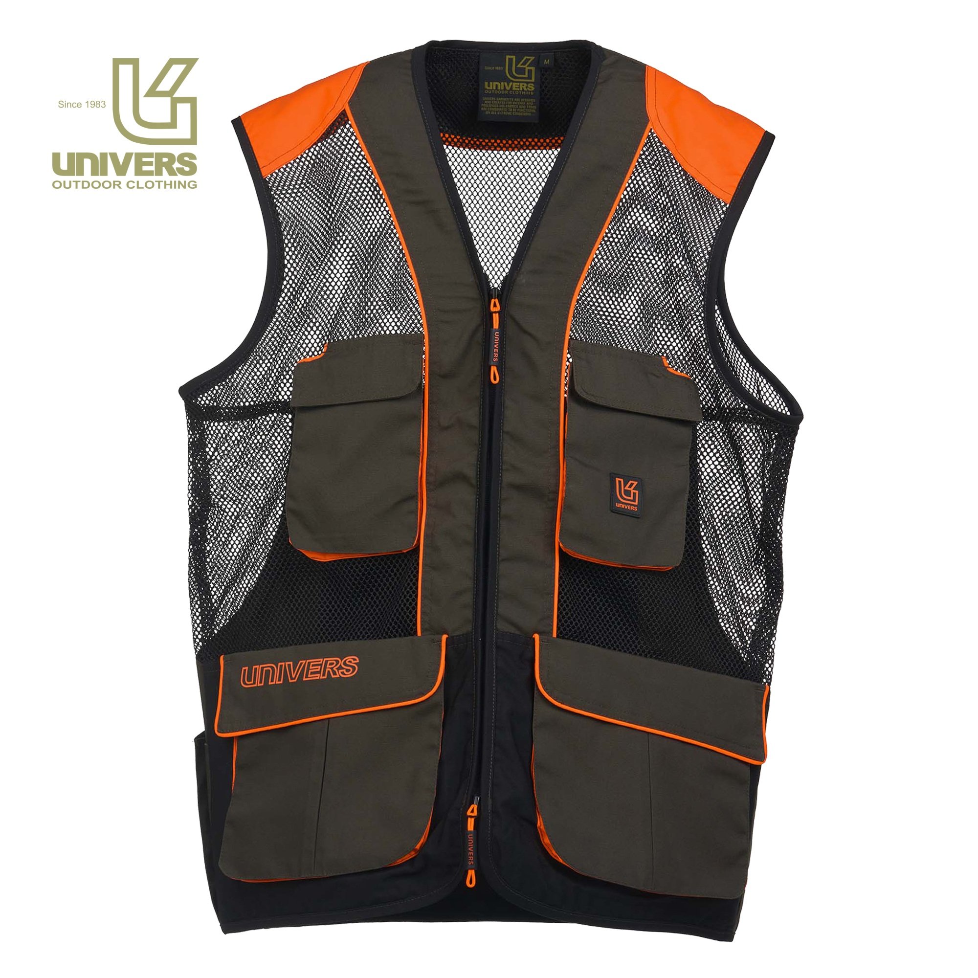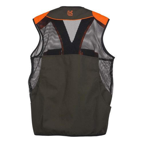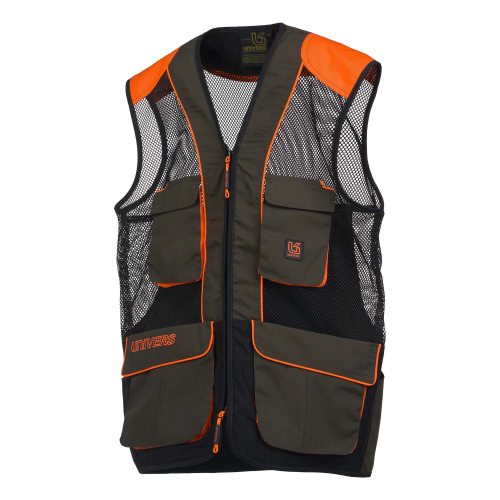 Gilet da caccia, realizzato in rete con quattro tasche frontali applicate in oxford impermeabilizzato. Le due tasche al petto hanno anche funzione di porta radio con passaggio per l’antenna. Le due tasche principali a soffietto con pattina al cui interno si trova cartucciera elastica. Ampio carniere a soffietto e due tasche interne con zip.