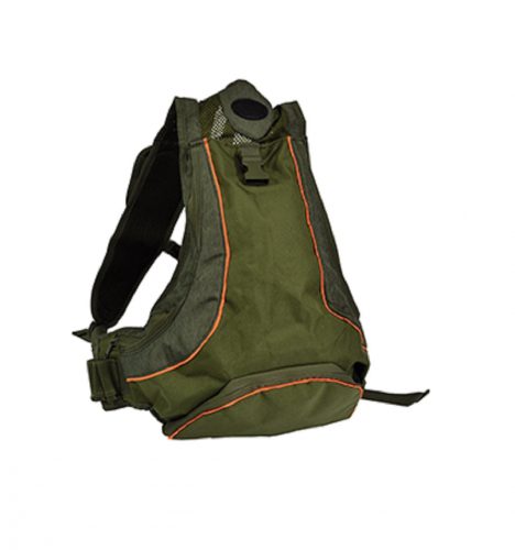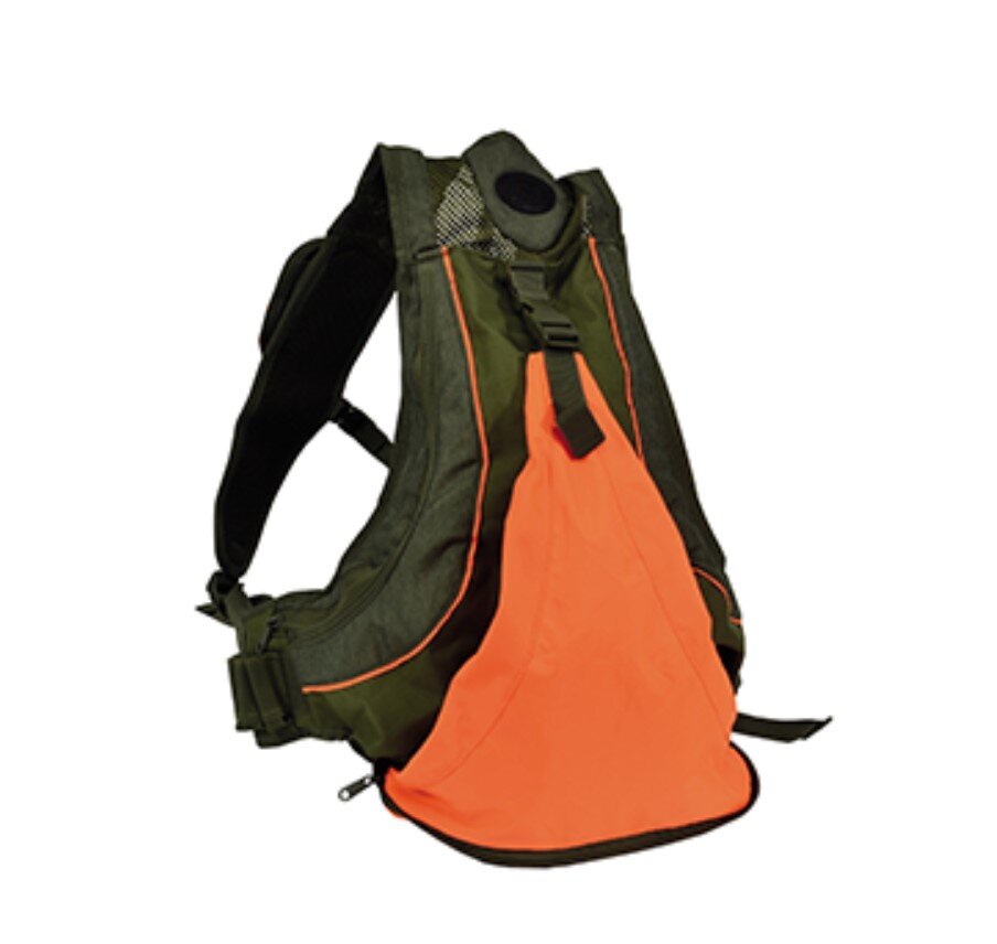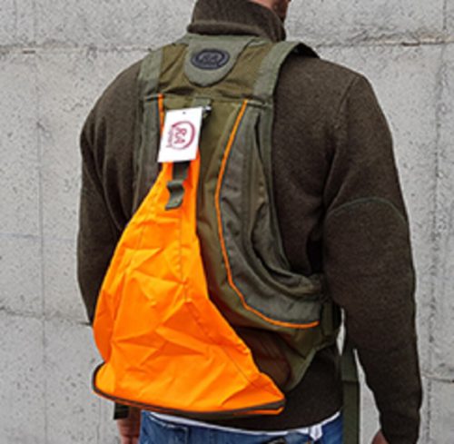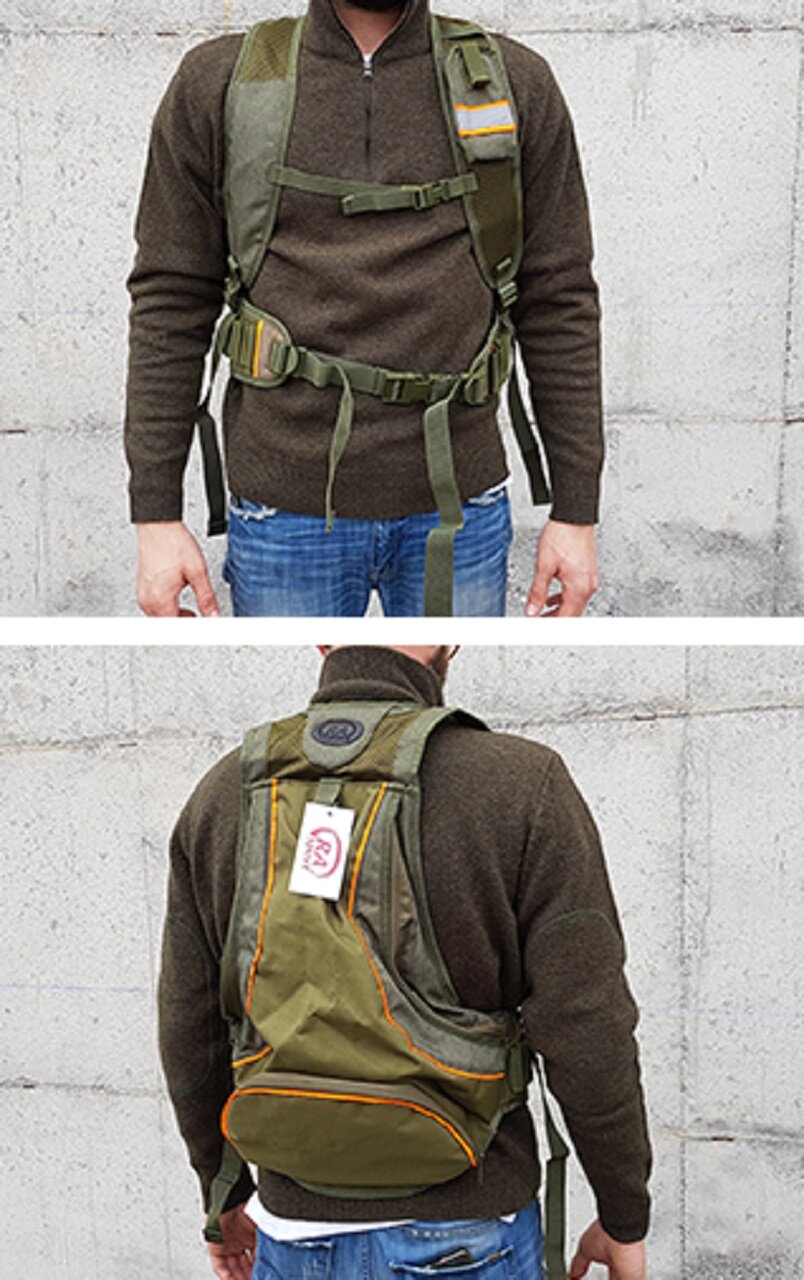 Trisacca in 600D con inserti arancioni a scomparsa, porta cellulare e doppio carniere.