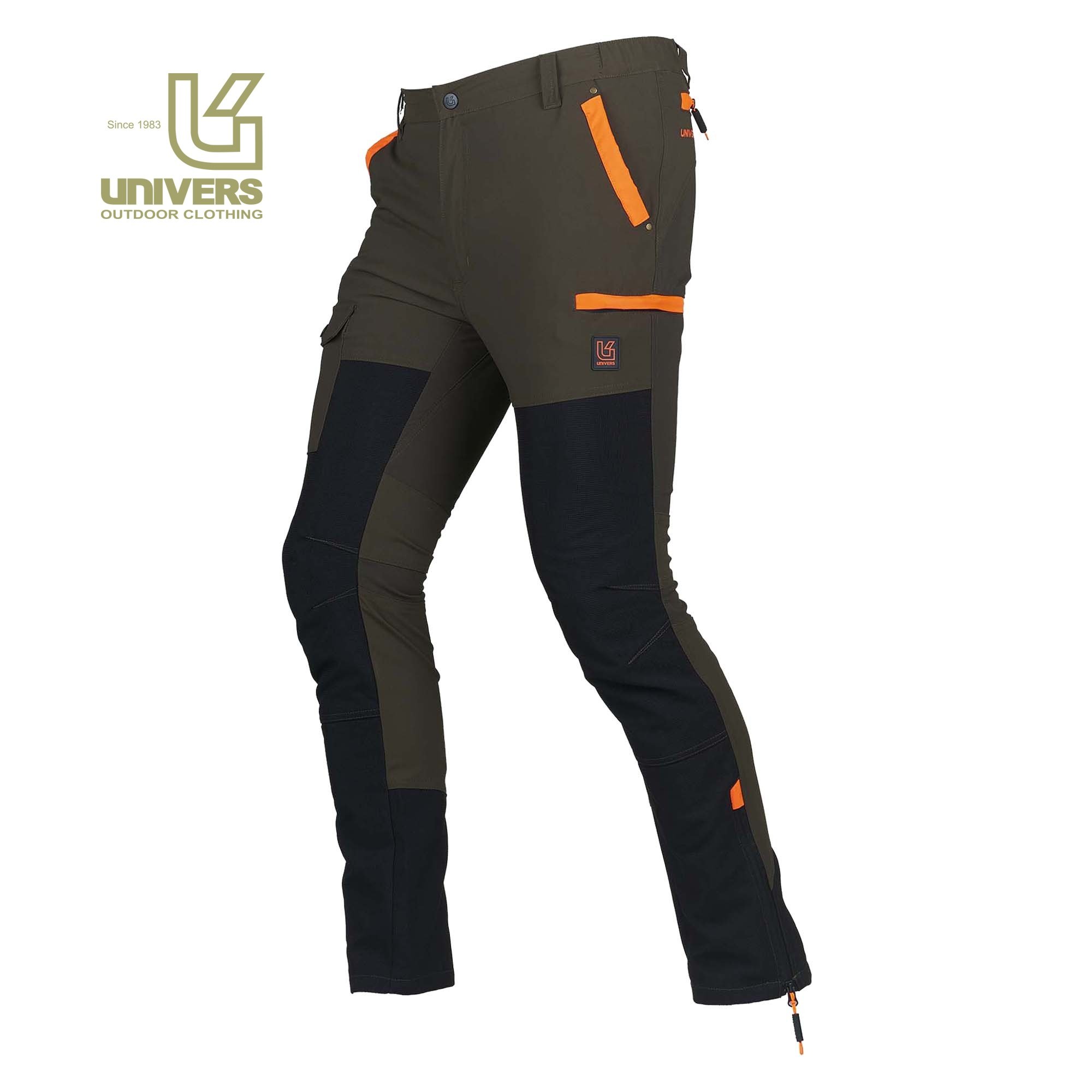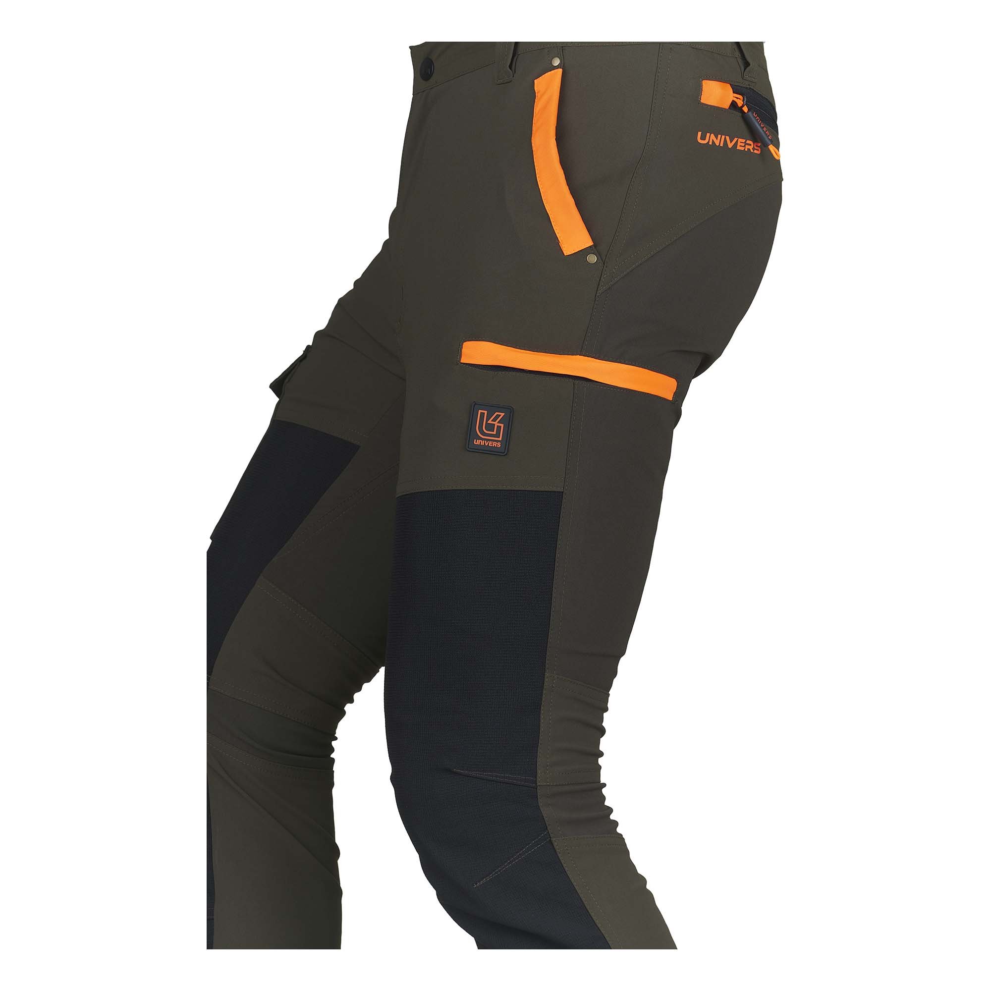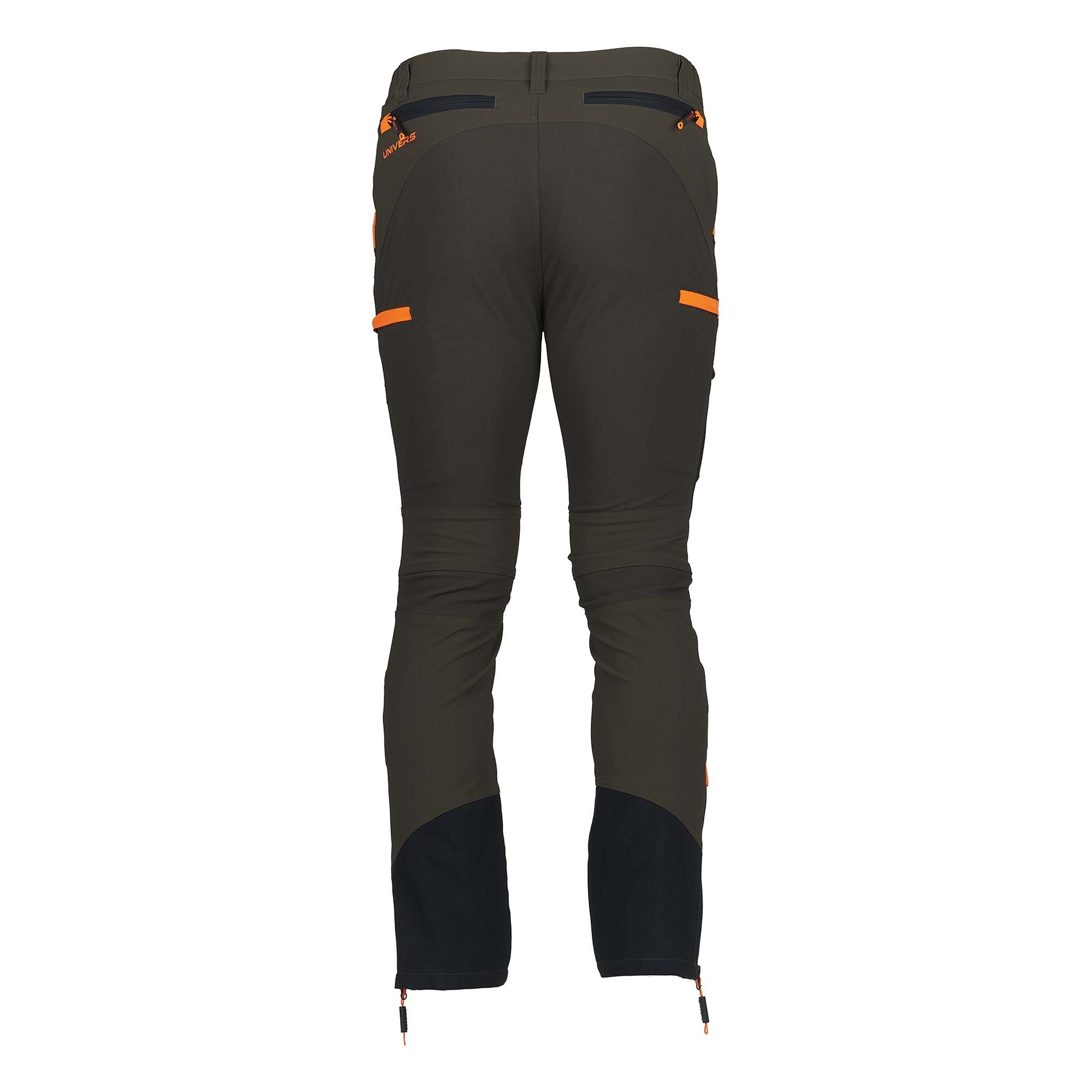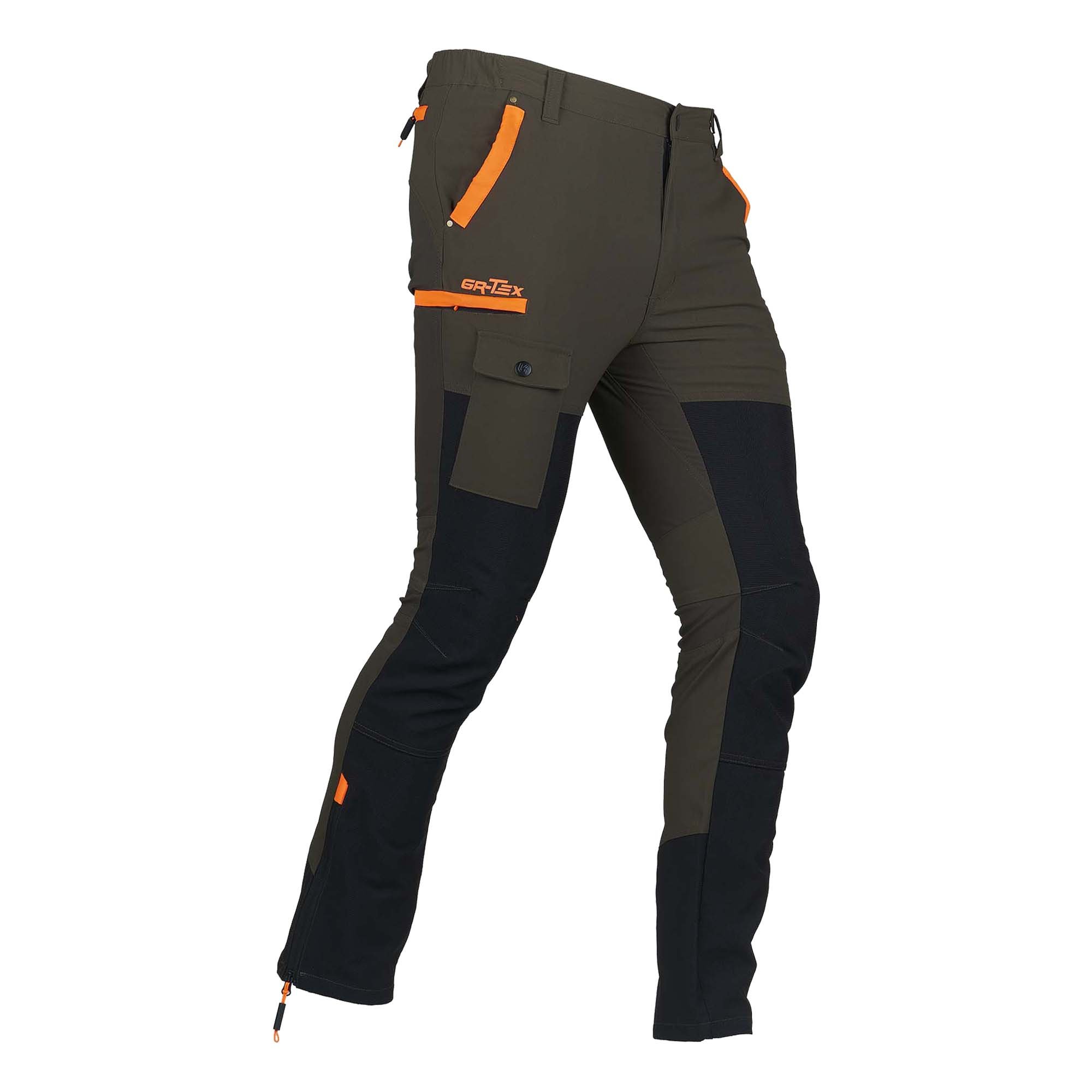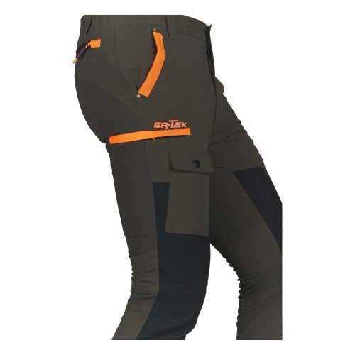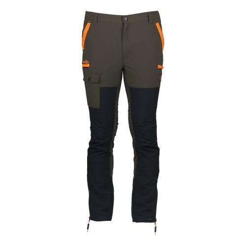 Pantalone da caccia PREDATOR, in robusto nylon elasticizzato idrorepellente e rinforzi in tessuto GR-TEX sulla gamba. Due tasche frontali, due tasche laterali a scomparsa con zip e una tasca porta cellulare, due tasche posteriori con zip, elastico ai fianchi, zip a fondo gamba